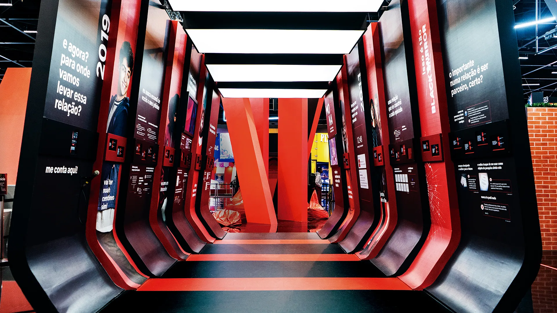A fita vermelha que originou o logotipo da marca é usada como guia principal para toda a linguagem dos espaços, é usada como inspiração inicial para todos os projetos nos espaços. Ele traz dinamismo ao ambiente, criando formas, dividindo planos e interconectando tudo o que acontece ao seu redor. É o ponto focal de toda a estrutura, a partir da qual nos abrimos para as atrações e depois para as interações do público.