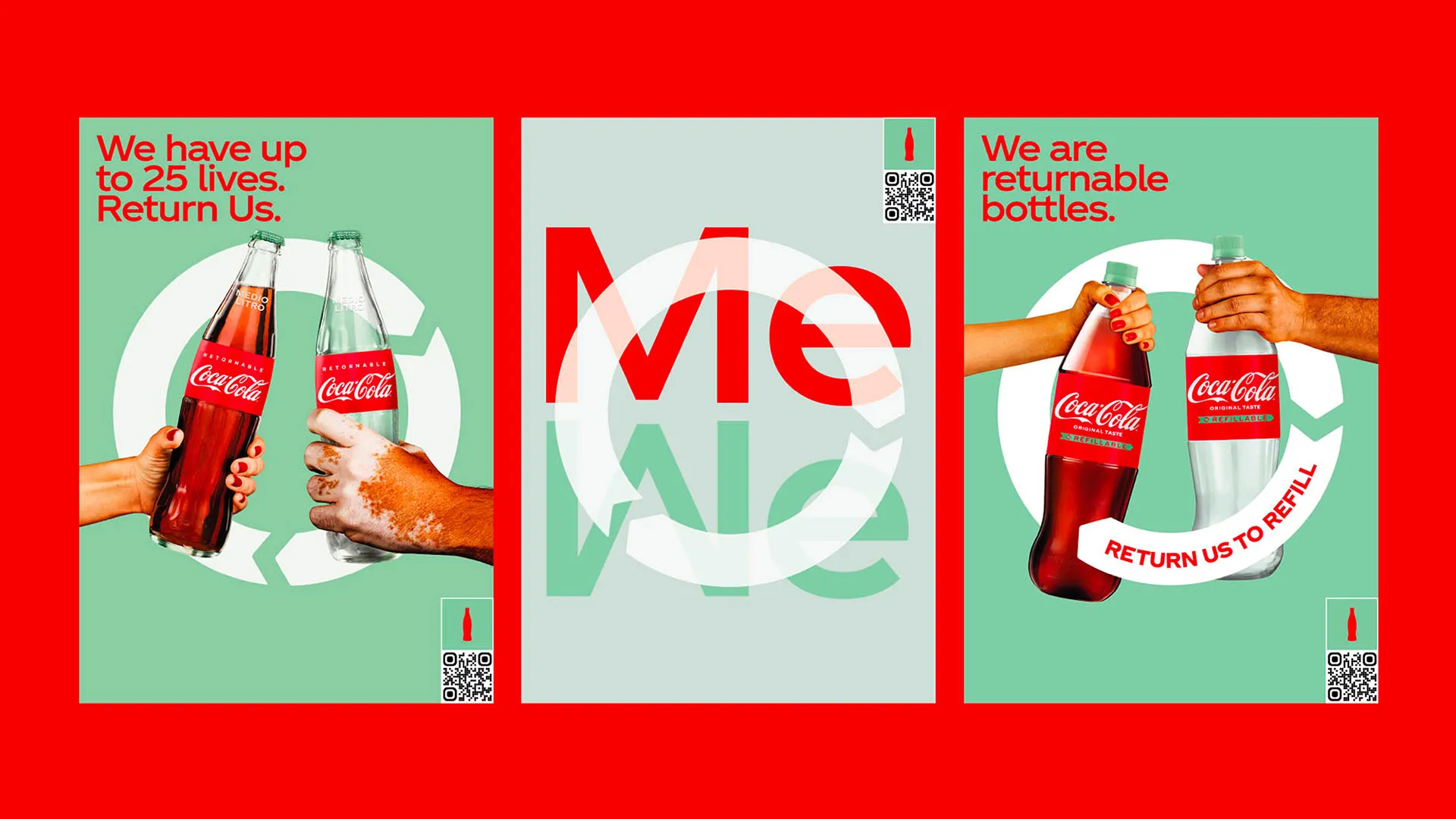 Um sistema onde produtos se tornam mensagens, ganhando voz para comprovar e convidar o público a fazer parte de um mundo mais circular. Inspirado no símbolo global de reciclagem, o projeto traz um elemento icônico e flexível, que vai além das embalagens e dá vida a um sistema gráfico em diferentes pontos de comunicação. Adapta-se às inovações em embalagens multipack de papelão Kraft 100% reciclável. Também foi resgatado um elemento histórico: a cor verde, o Georgia Green, inspirada na primeira garrafa de vidro da Coca-Cola, complementando a cor vermelha icônica e reforçando que as embalagens são feitas para serem refeitas, recicladas e retornadas, promovendo novas ideias sustentáveis.