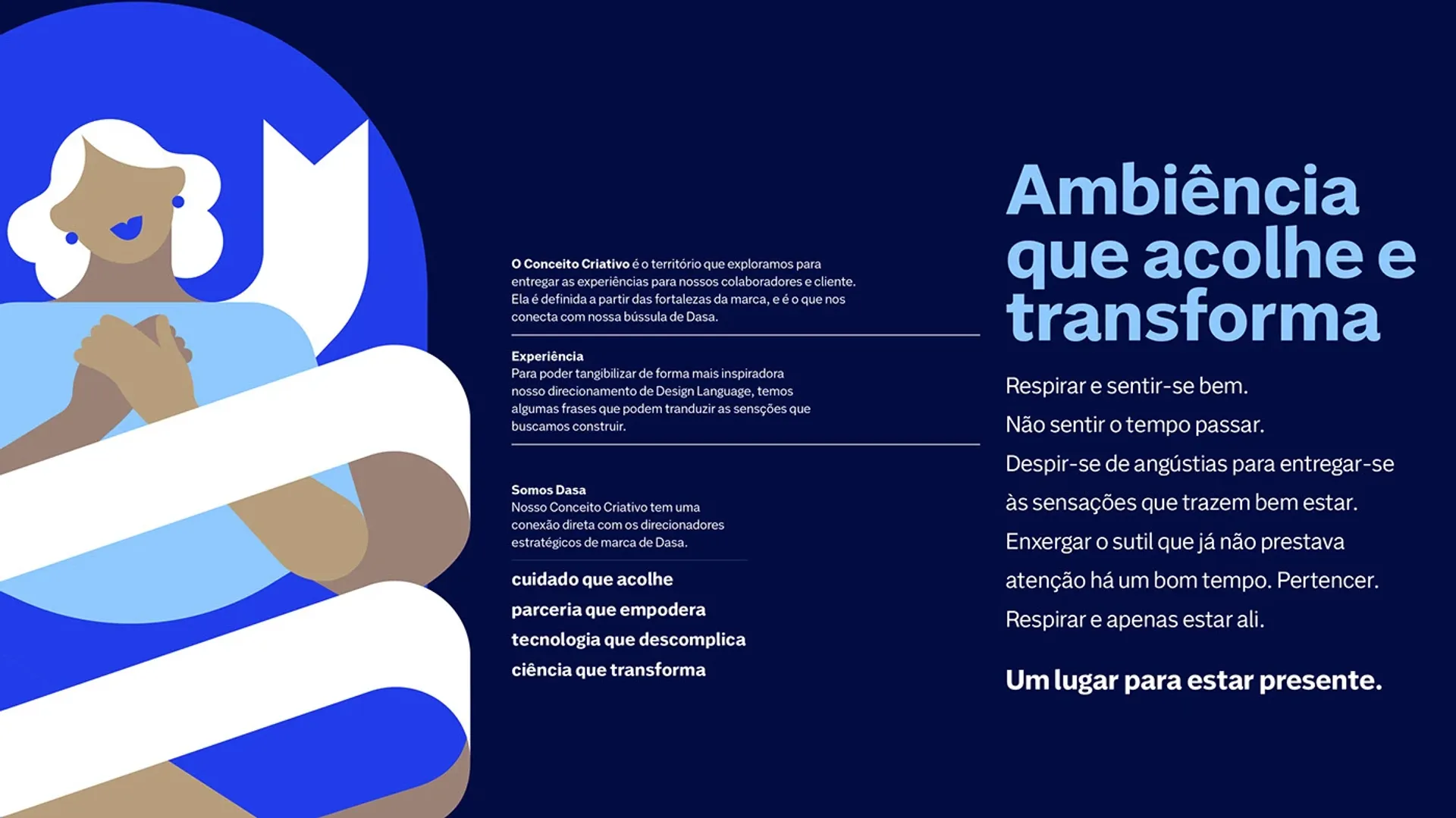 Respirar e sentir-se bem. Não sentir o tempo passar. Despir-se de angústias para entregar-se às sensações que trazem bem-estar. Enxergar o sutil. Pertencer. Respirar e apenas estar ali. Um lugar para estar presente. Com um sistema FIX, FLEX, FREE, criamos orientações e exemplos de como ampliar a experiência da marca Dasa para ambientes e espaços, garantindo unidade do maior ecossistema de saúde da América Latina, mas respeitando o espaço de adaptação para cada jornada com clareza e consistência.