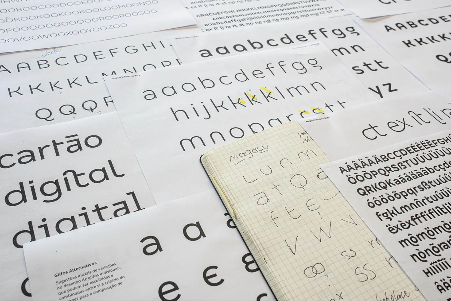 Tudo começou no logotipo, o epicentro de todo o sistema de identidade. A redução do nome, de “Magazine Luiza” para apenas “Magalu” foi resolvida pela Tátil ao propor versaletes (desenhos maiúsculos, reduzidos) nas letras “M” e “L”. A Fabio Haag Type explorou variações em algumas rodadas de colaboração com os designers da Tátil, e refinou nos mínimos detalhes a versão aprovada. A partir dali, uma paleta tipográfica com três famílias foi criada, cada uma com a sua razão de ser: Magalu Títulos, Magalu Textos e Magalu Submarcas.