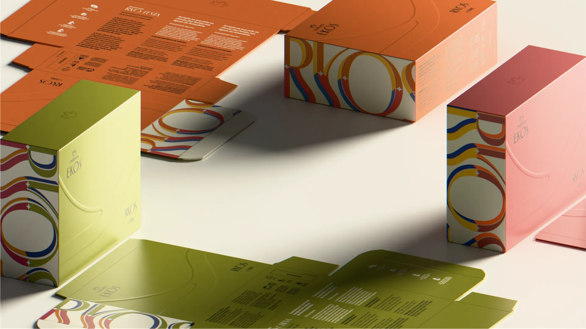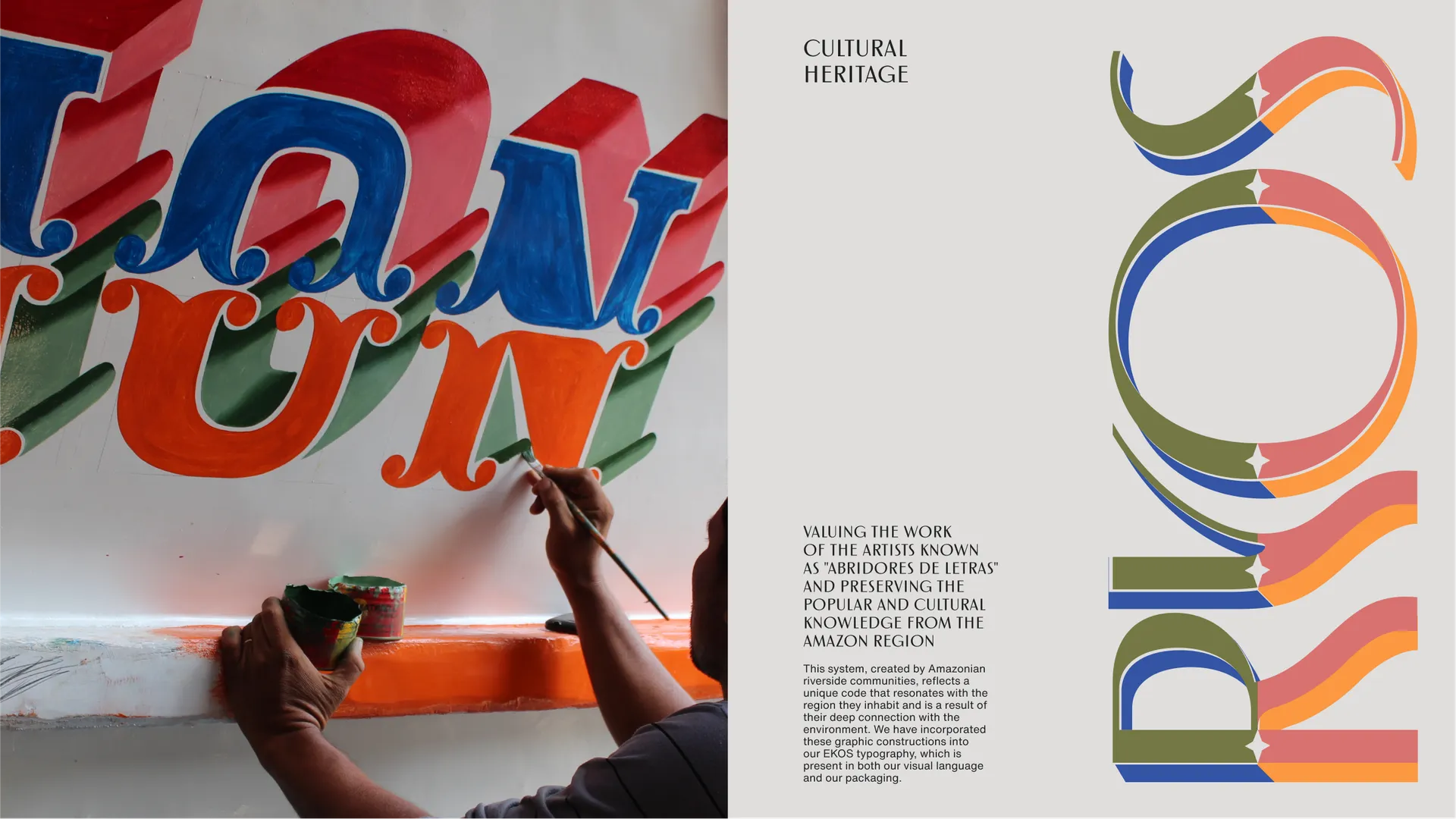 Com o objetivo de valorizar o trabalho dos artistas conhecidos como “Abridores de Letras” e preservar esse conhecimento popular e cultural da região amazônica, convidamos, junto com a curadoria de Fernanda Martins, 17 artistas para criar a marca RYOS, cada um com suas próprias características distintas. Durante todo o processo, aprendemos sobre os elementos criativos que distinguem as letras decorativas amazônicas e identificam a autoria de cada artista, como a divisão predominante das letras em duas partes, conhecidas como “caqueados” (enfeites decorativos no corpo da carta). Esse sistema, criado pelas comunidades ribeirinhas da Amazônia, reflete um código único que ressoa com a região em que habitam e é resultado de sua profunda conexão com o meio ambiente. Incorporamos essas construções gráficas em nossa tipografia EKOS, que está presente em nossa linguagem visual e em nossas embalagens.