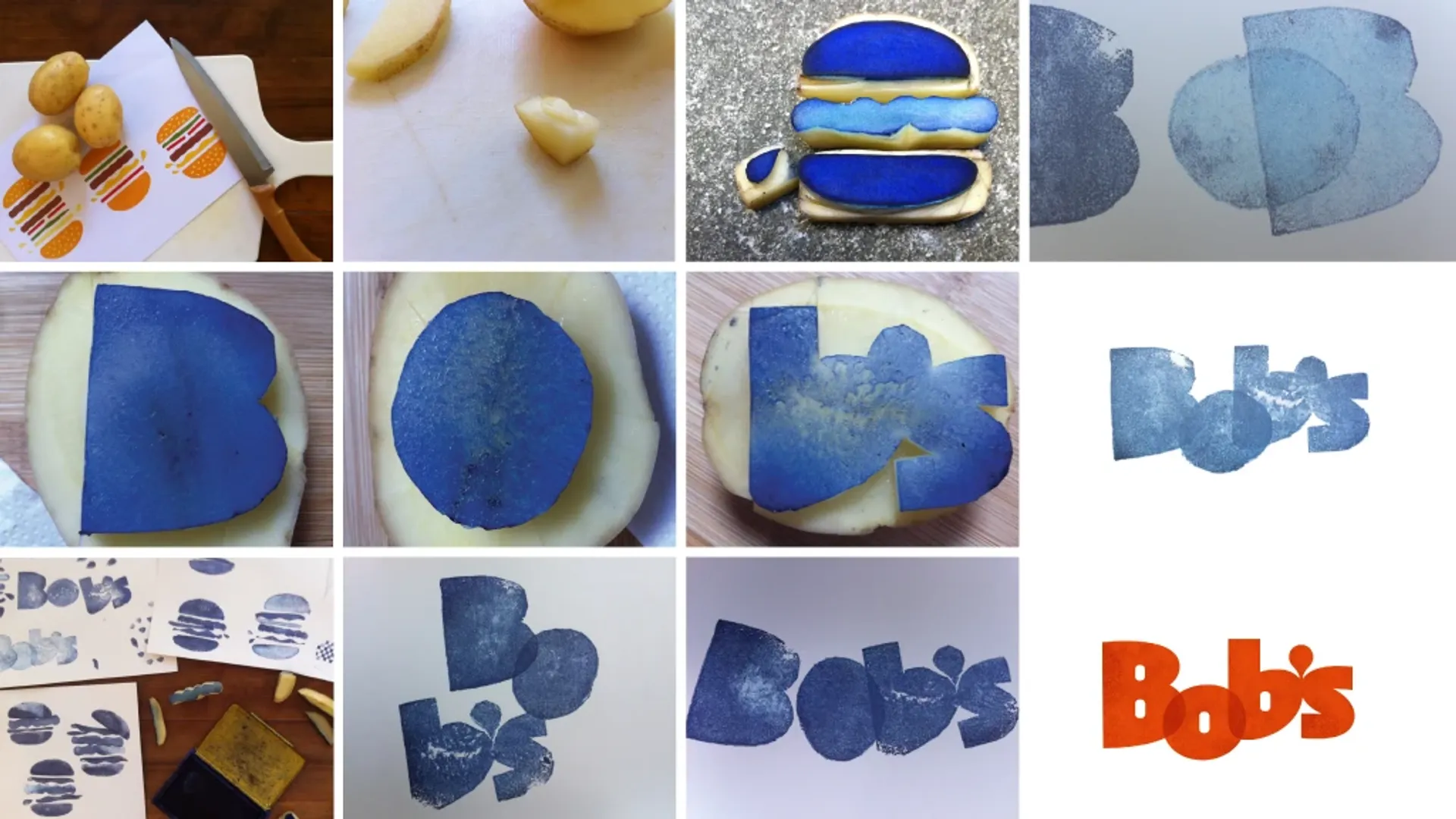 Escolhemos uma técnica artesanal. Criamos carimbos feitos a partir de um delicioso ingrediente do próprio Bob´s: batatas.Sim, a nova marca nasceu de uma batata real esculpida à mão, com um resultado que é pura textura e sensação.