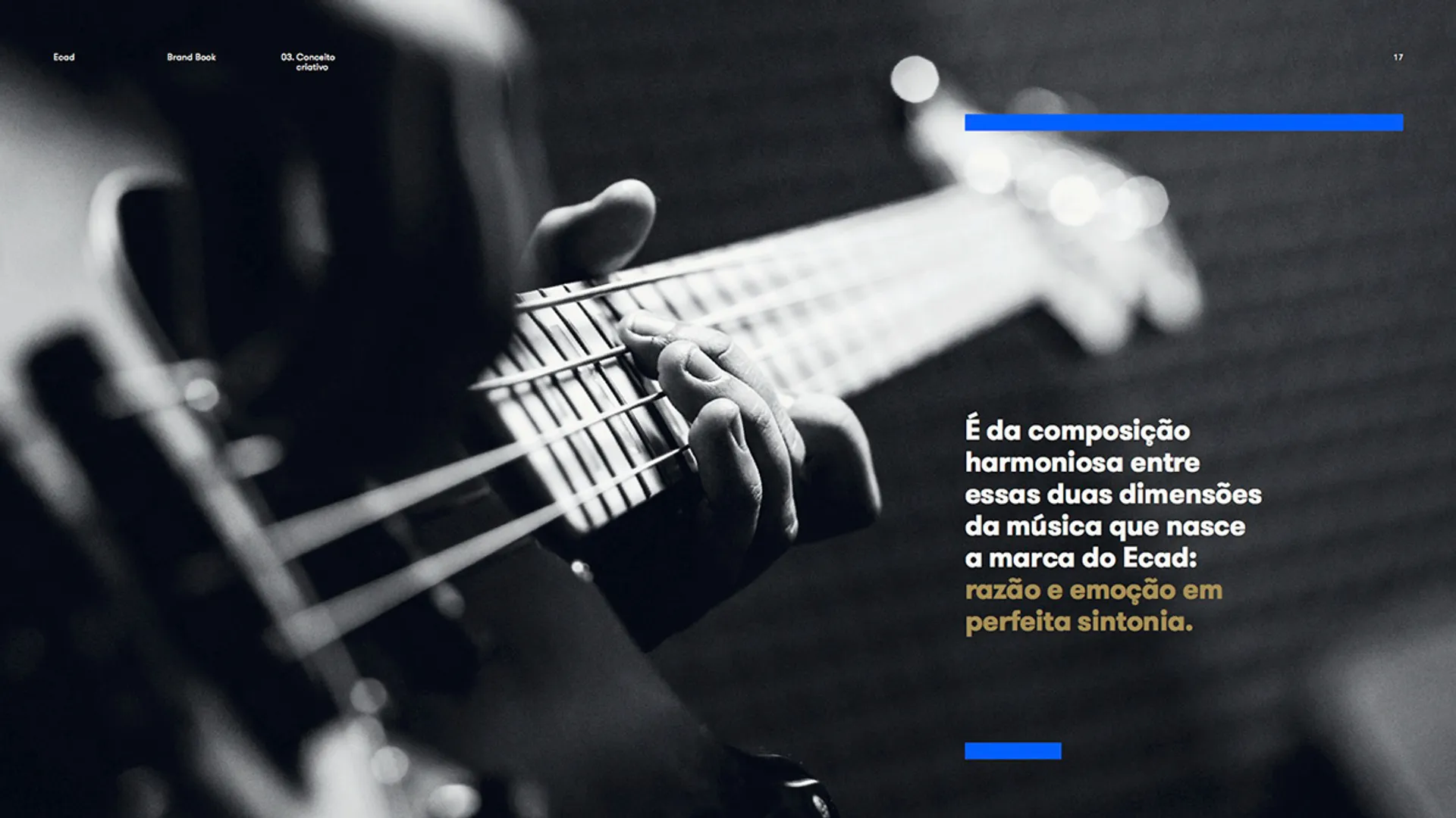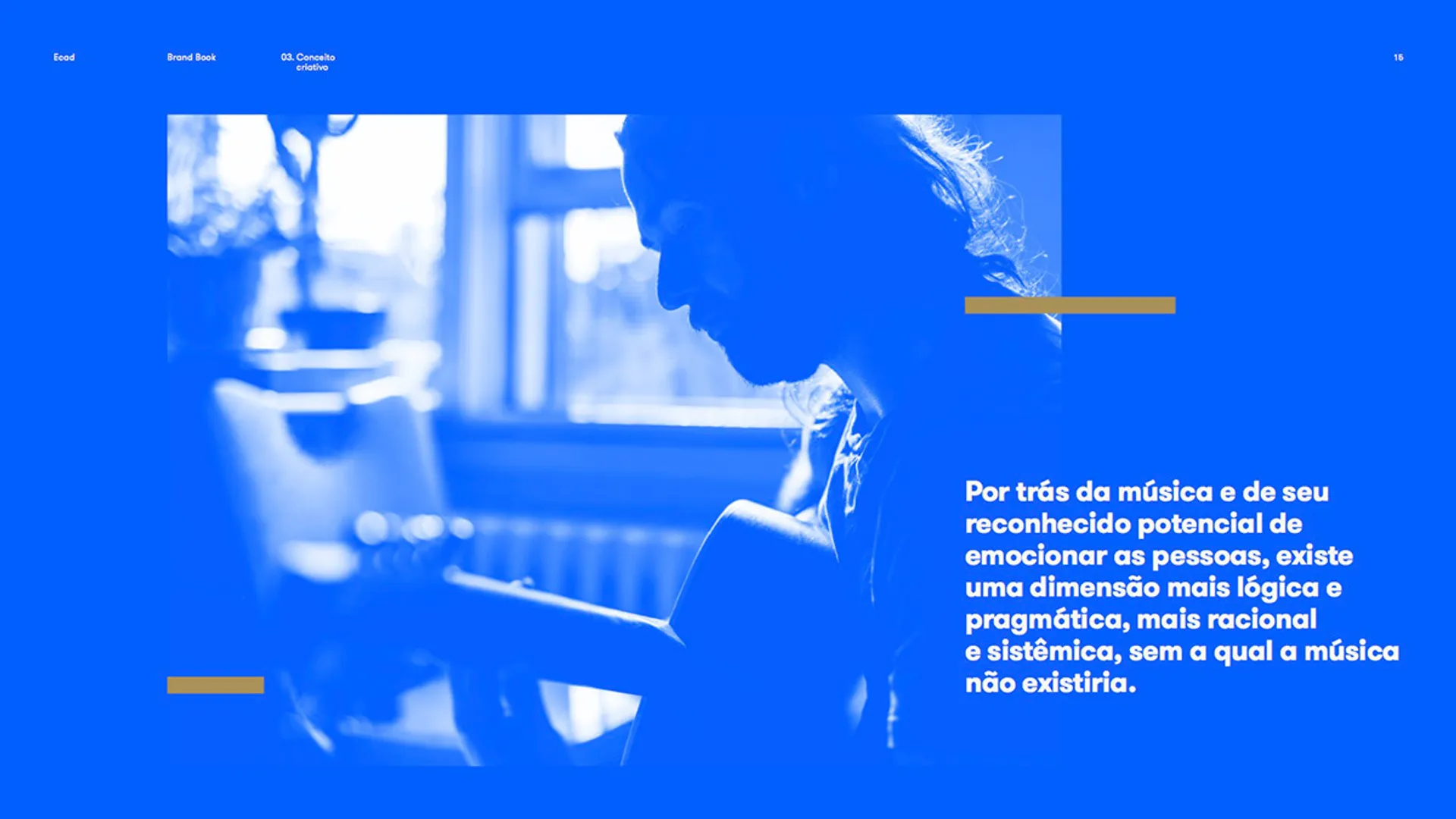 Modularity and movement. Articulation and rhythm. The new logo takes advantage of the most inspiring dimension of music to represent Ecad as the element that unites the different parts of an ecosystem, generating connection and balance. It connects and inspires empathy, materializing Ecad’s purpose of being an instrument that exists to keep music alive.